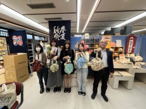 また、ふろしきバッグの作り方もレクチャーして頂きました。ふろしきが身近でない学生パーソナリティにとって「難しそうと思っていたけど意外と簡単」「どの面をみせたいかを工夫することで、同じふろしきでも顔が変わる」という発見がありました。