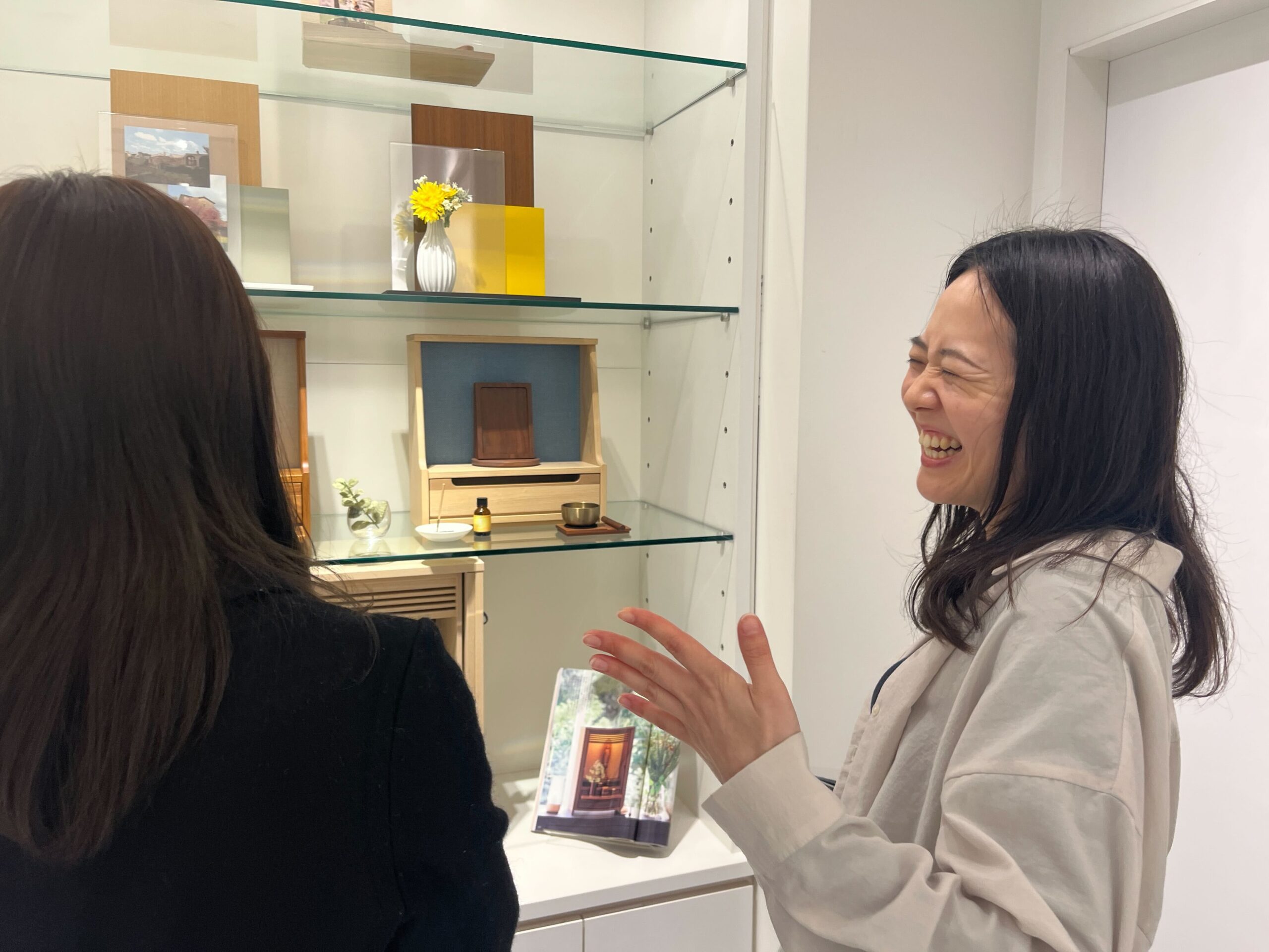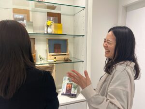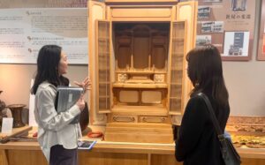 1階入り口はお香(お線香)が並び、ちりめん細工、和紙、截金の工芸品などを求めることができます。写真は1階奥。学生が「インテリアかと思った」と話す家庭用仏具が並んでいます。